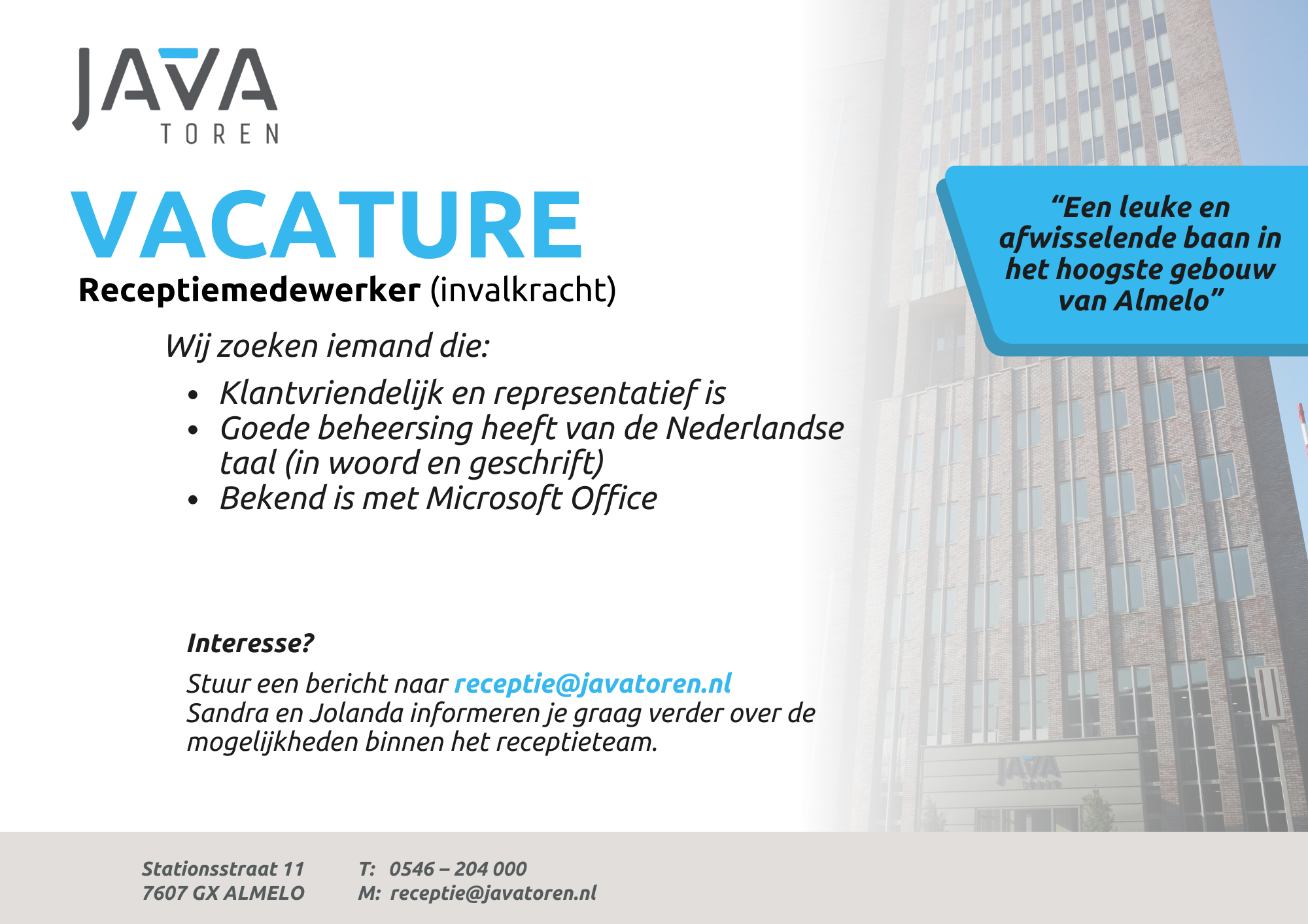 De Java Toren is gebouwd in 2007 en onlangs heeft het gebouw een transformatie ondergaan. Er is een nieuwe riante entree gecreëerd aan de kadezijde en u wordt begroet door onze stralende receptionistes. Het visitekaartje van uw onderneming.